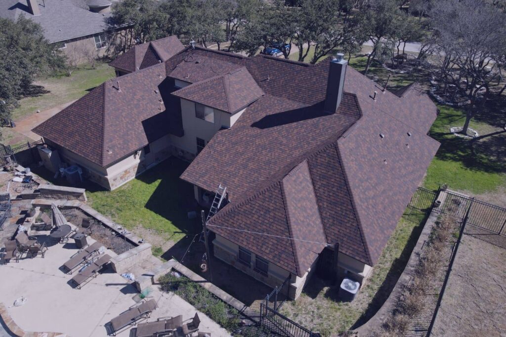Aerial drone view of a large residential home with a brown shingle roof, used to inspect for common signs you need a new roof like granule loss or wind damage.